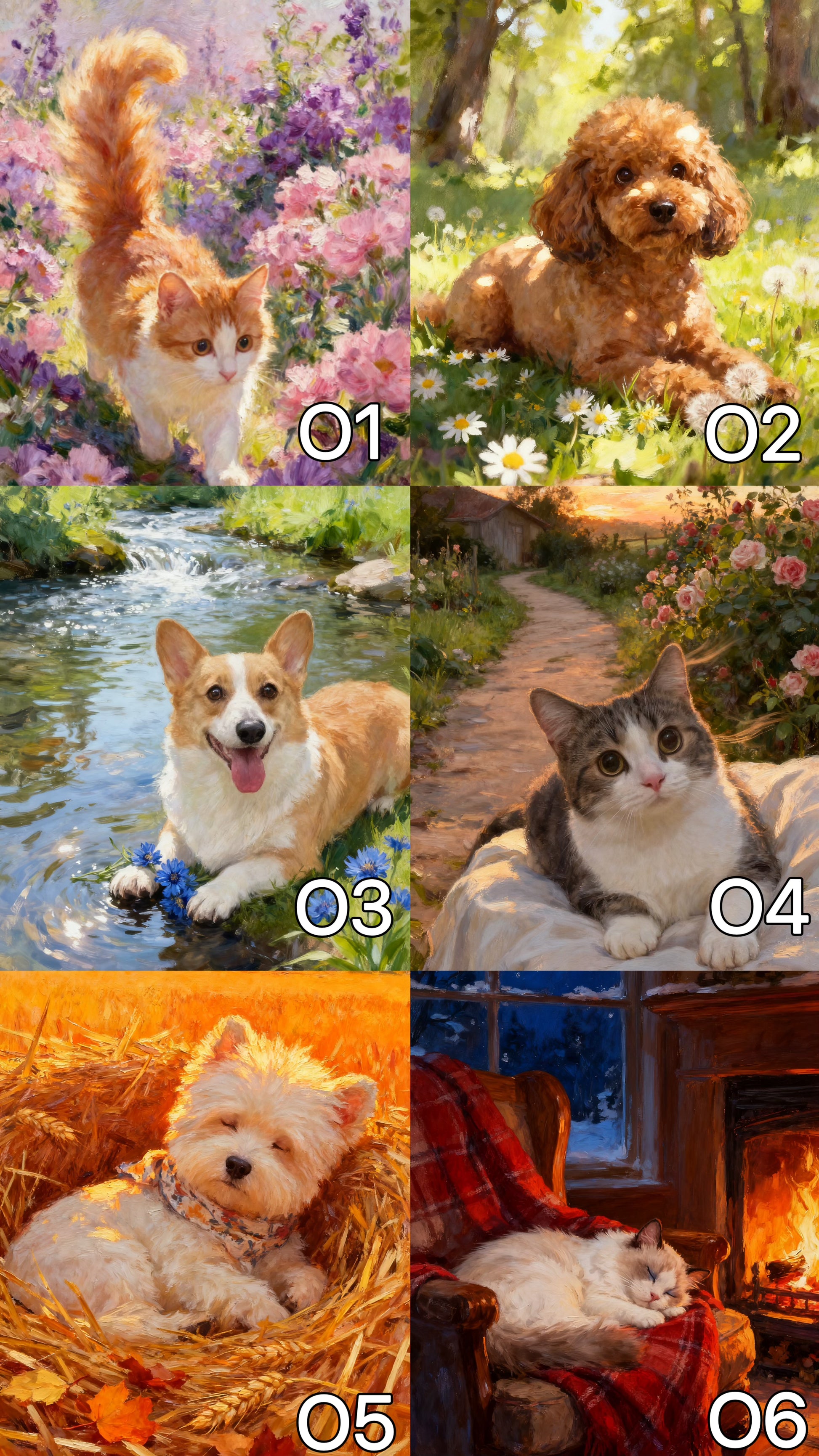 Place your beloved pet in a serene countryside setting! Our custom pet portraits offer multiple natural styles, digitally hand-painted from your photos to create warm, rustic oil painting portraits.